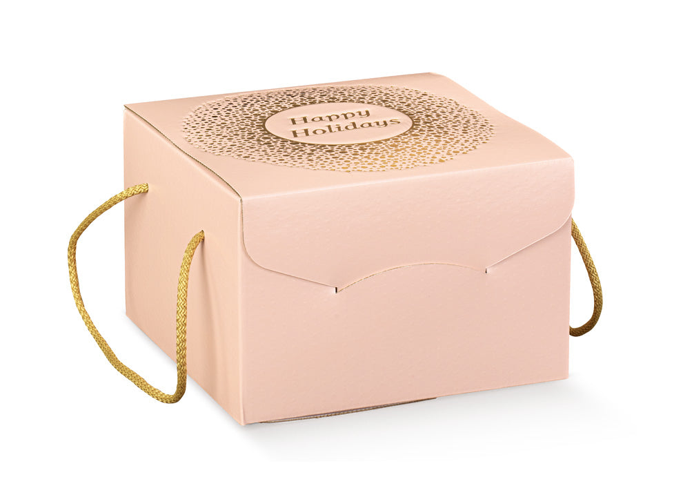 Elegante scatola segreto cipria 23x23x25,5cm con raffinata stampa oro a caldo e manici in cotone, ideale per confezioni preziose e regali esclusivi.