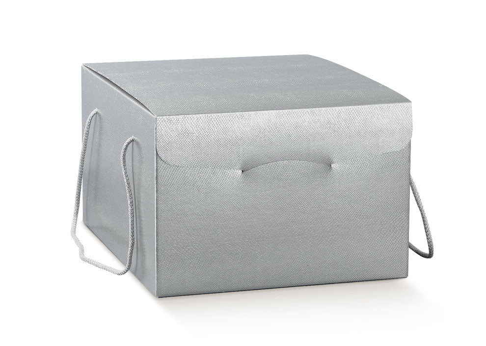 Scatola con apertura a scrigno con finitura skin argento e manici in cotone argento, ideale per doni gastronomici eleganti e regali raffinati.