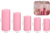 Perfect for elegant and sophisticated settings. Set of 5 pink metal cylinders in different sizes, ideal for creating fascinating and original scenic arrangements.