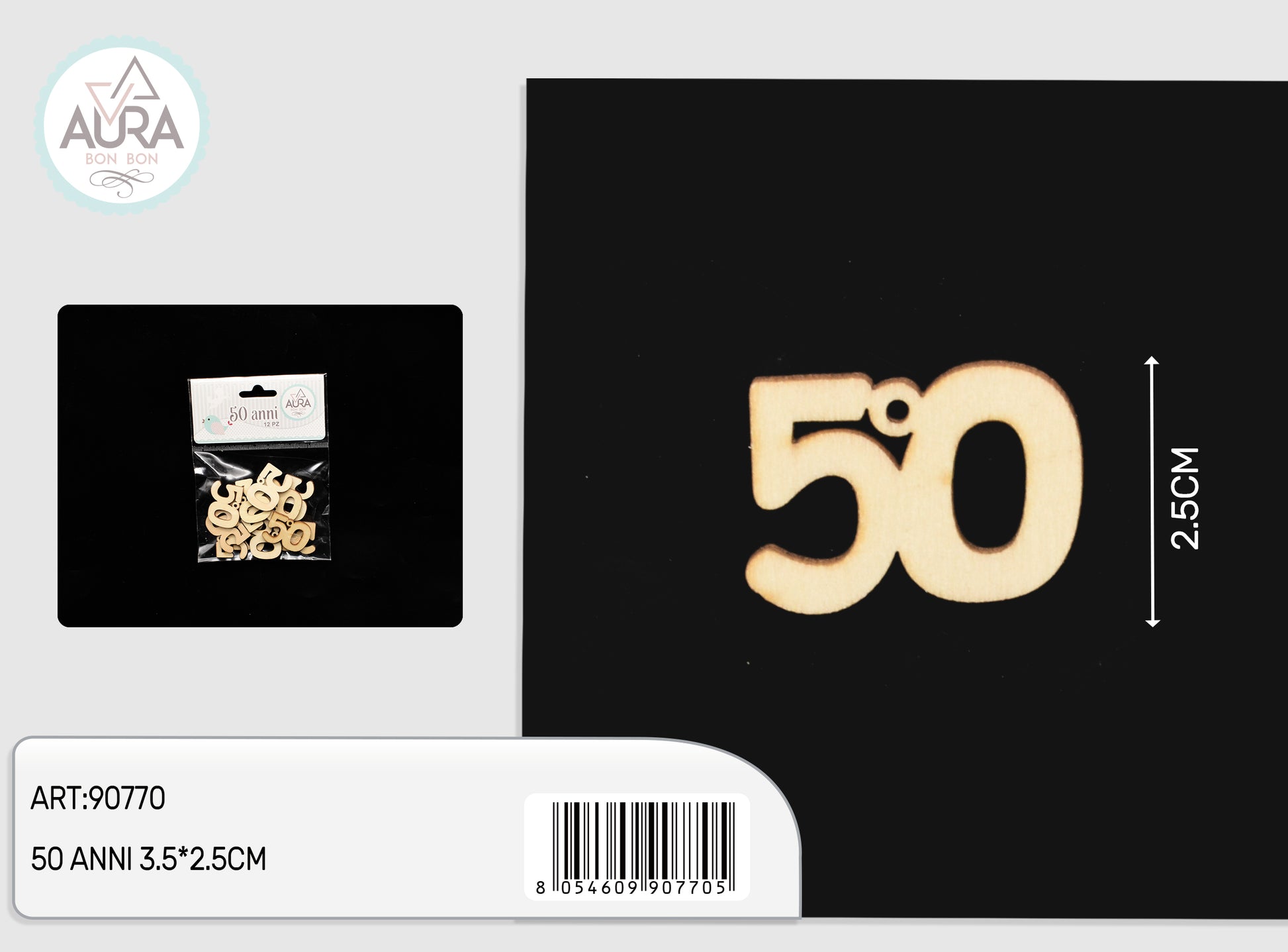 Confezione da 12 tag in legno color argento con numero "50", ideali per festeggiamenti raffinati e speciali.