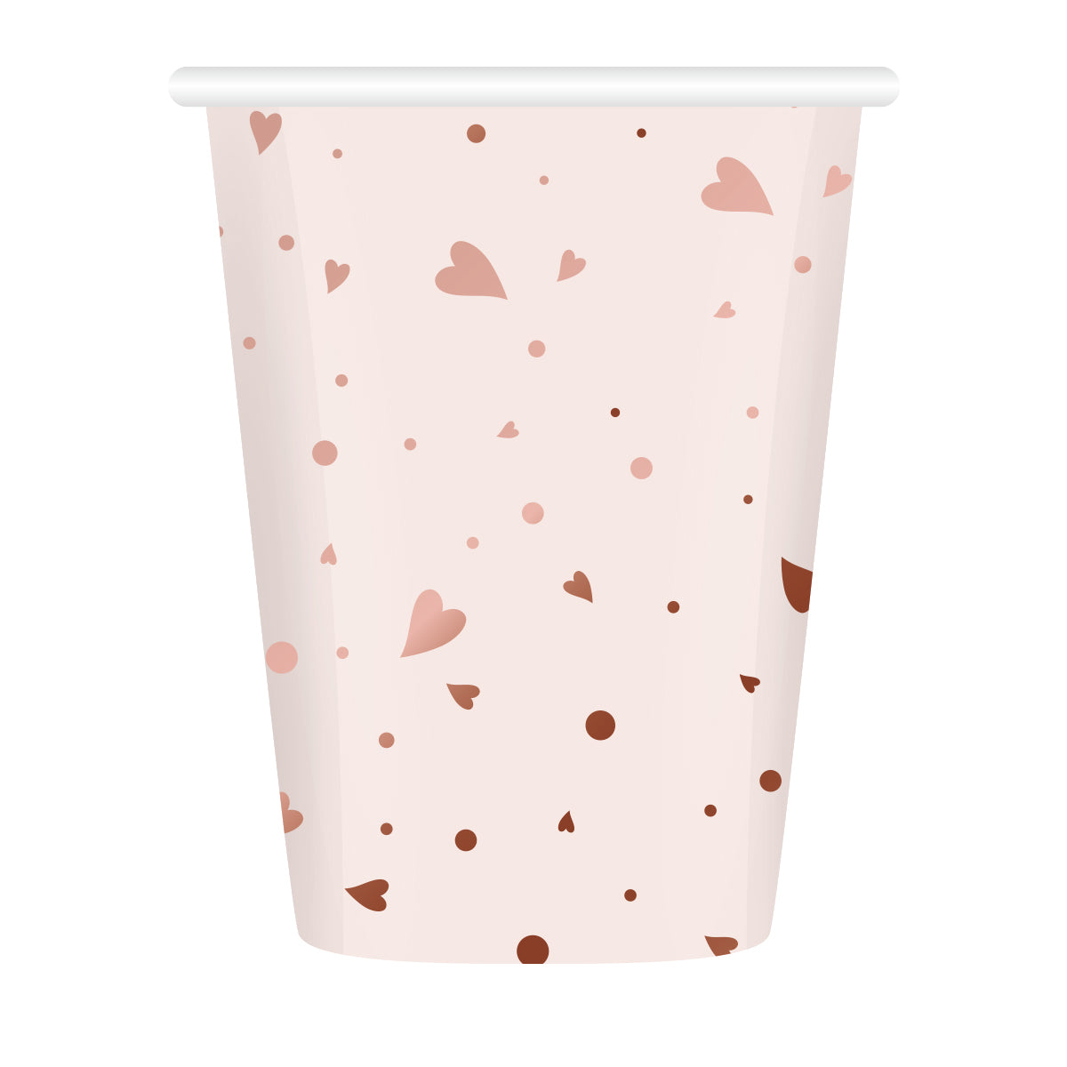 Set da 8 bicchieri rosa da 200 cc con scritta "Happy Birthday", perfetti per feste di compleanno dolci e allegre.