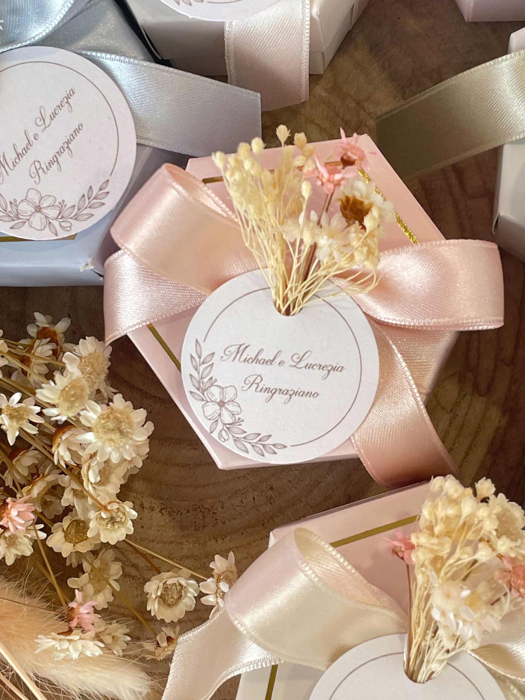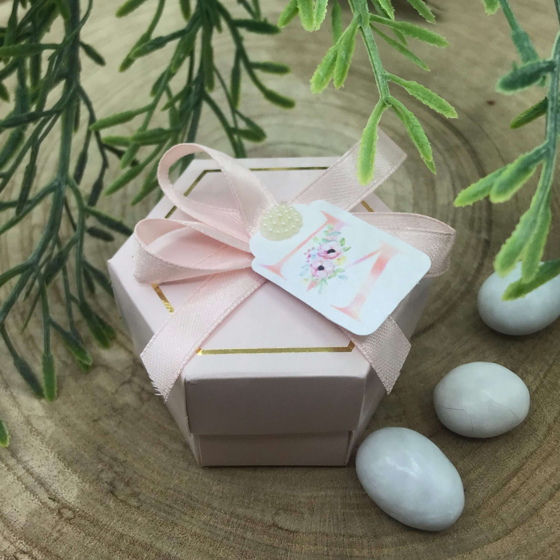 Astuccio esagonale in cartoncino rigido rosa cipria con elegante bordo oro. Perfetto per confetti, caramelle o piccoli pensieri raffinati.