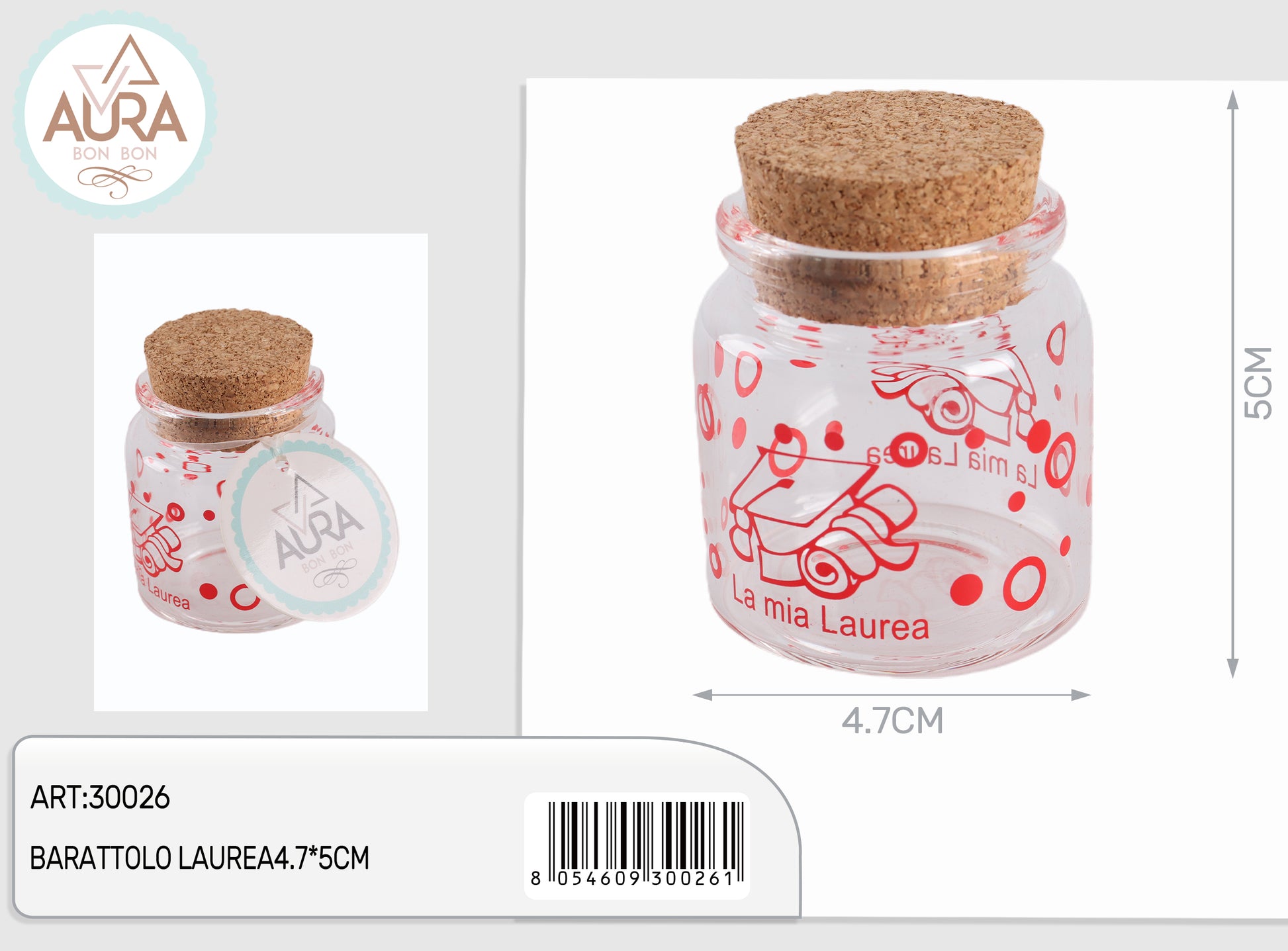 Barattolino di vetro decorato con i simboli della laurea, perfetto come bomboniera o segnaposto per festeggiare questo traguardo speciale. Elegante e raffinato, arricchito con dettagli come il tocco, la pergamena e la scritta "La Mia Laurea", è ideale per contenere confetti o piccoli dolci e lasciare un ricordo indimenticabile agli ospiti.