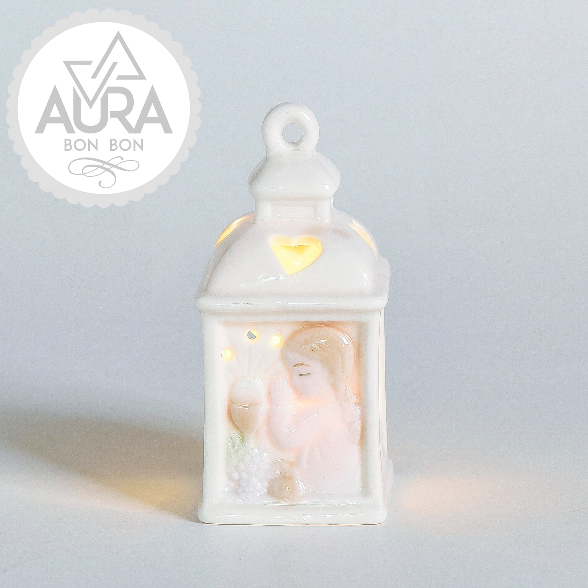 Raffinata lanterna in ceramica decorata con l’immagine di una bambina in preghiera accanto al calice eucaristico. La luce LED interna diffonde un bagliore caldo attraverso i dettagli intagliati a forma di cuore, creando un’atmosfera dolce e spirituale. Perfetta come ricordo della Prima Comunione, unisce eleganza e significato religioso.