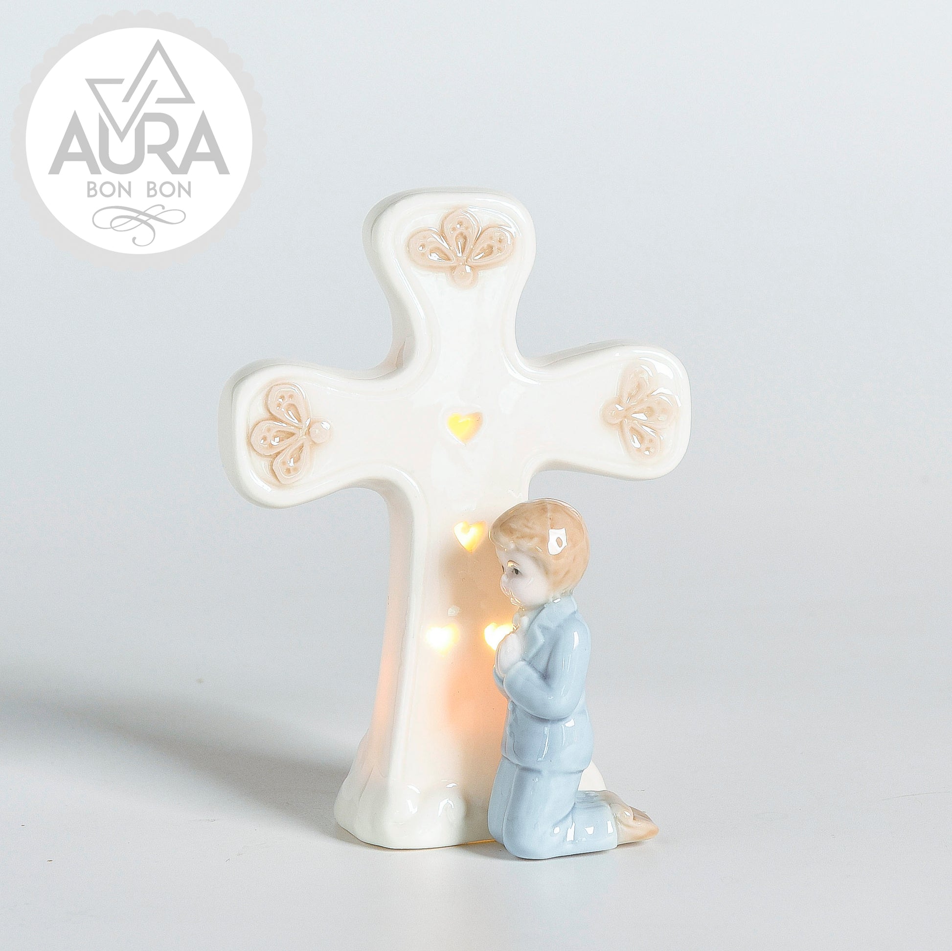 Elegante bomboniera in ceramica raffigurante un bambino in preghiera accanto a una croce decorata con dettagli in rilievo e dolci cuori illuminati da una luce LED. Perfetta per celebrare la Prima Comunione con un ricordo speciale, dal design raffinato e dai colori delicati. Un simbolo di fede e spiritualità ideale per questa importante occasione.