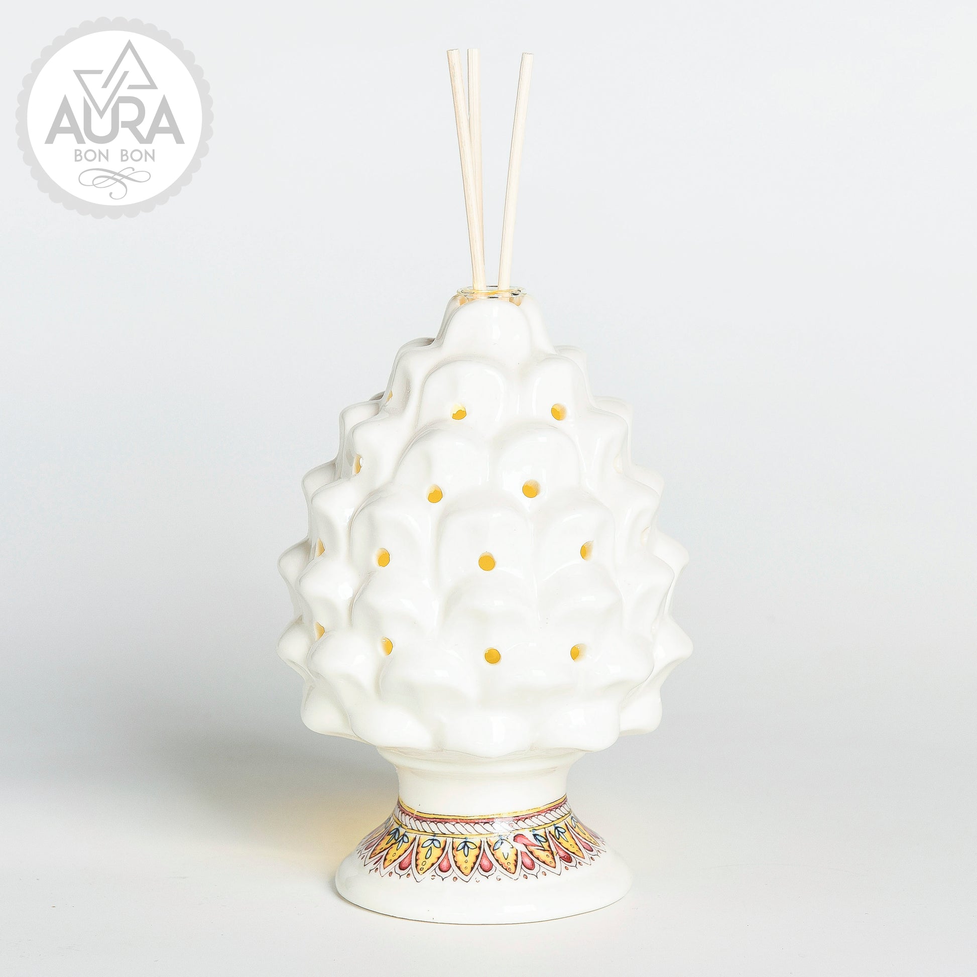 Questo raffinato diffusore di fragranze unisce eleganza e funzionalità. La sua forma ispirata alla tradizione artigianale è impreziosita da dettagli dorati, mentre la luce LED interna crea un'atmosfera suggestiva illuminando delicatamente i piccoli fori sulla superficie. Perfetto per profumare l’ambiente con stile, aggiunge un tocco di charme e calore a qualsiasi spazio. Ideale come bomboniera per eventi speciali o come regalo esclusivo.