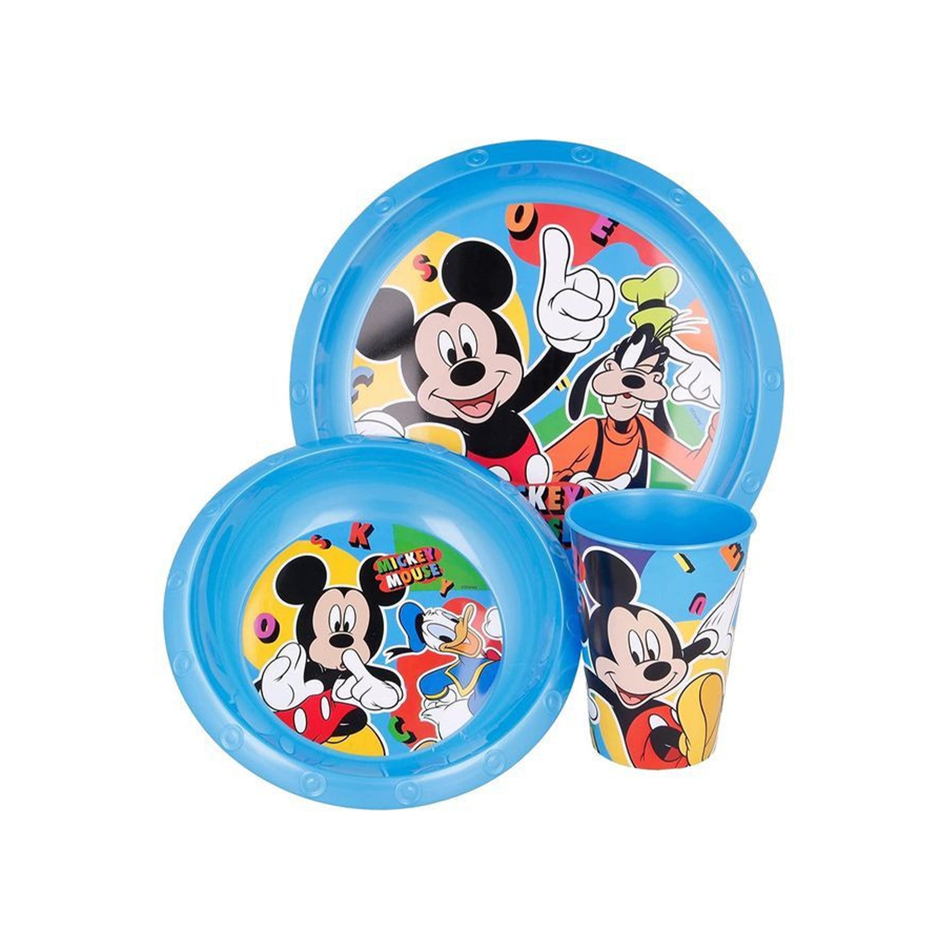 Set Mickey Mouse 3 pezzi: piatto fondo, piatto piano e bicchiere, ideale per pranzo e merenda con un tocco divertente e colorato.