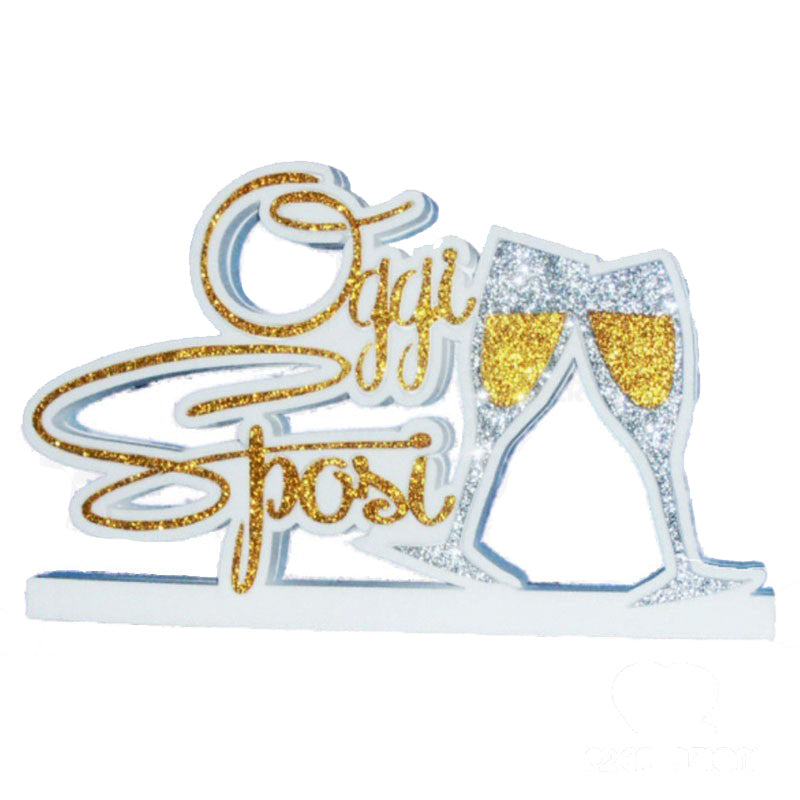 Polistirolo "oggi sposi" con calici in oro glitter, perfetto per decorare con eleganza ogni festa nuziale, aggiungendo un tocco scintillante e raffinato.