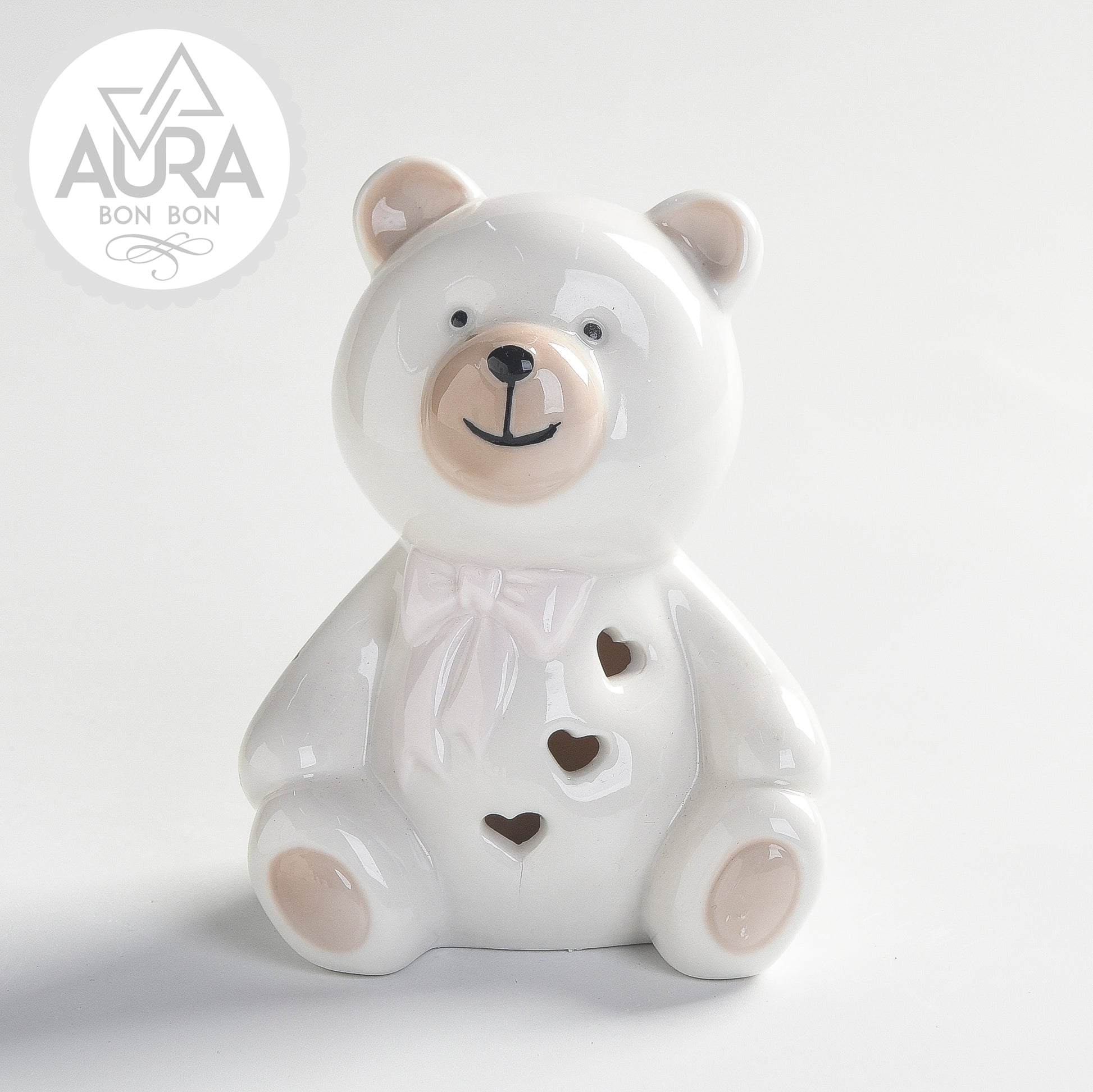 Orsetto in ceramica bianca con fiocco e cuoricini traforati. Un'idea regalo dolce e raffinata, perfetta per decorare camerette o come bomboniera per occasioni speciali.