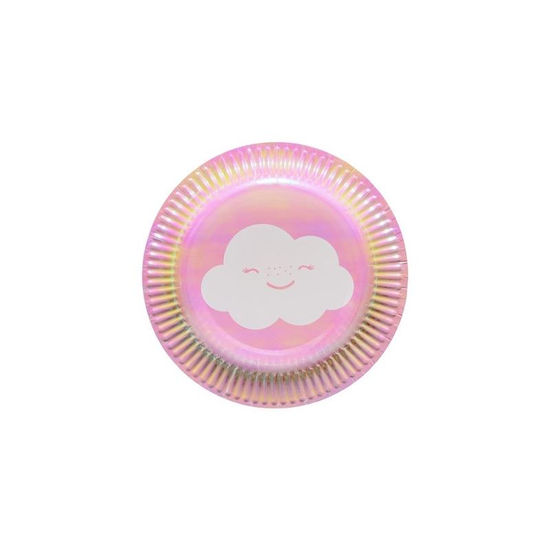 Scopri il piatto 18 cm iridescente Nuvoletta & Arcobaleno, perfetto per rendere ogni festa colorata e divertente con un tocco magico e brillante!