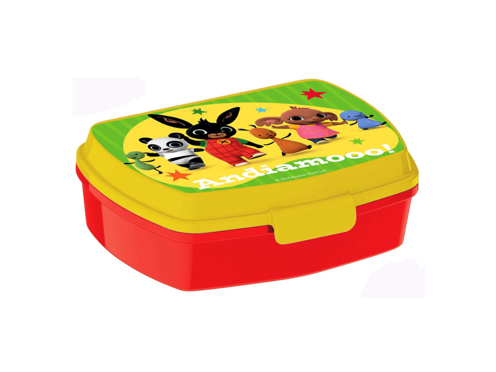 Portamerenda allegro e colorato con i personaggi di Bing su sfondo giallo-verde. Con chiusura sicura, ideale per scuola, gite o merende divertenti!
