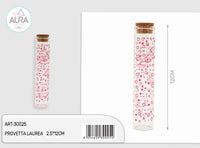 Provetta in vetro decorata con stampe rosse a tema laurea, un'idea originale per celebrare questo importante traguardo. La provetta, elegante e raffinata, può essere utilizzata per contenere confetti o piccoli regali, aggiungendo un tocco personalizzato e simbolico all'occasione. Perfetta per completare bomboniere o come elemento decorativo per feste di laurea.