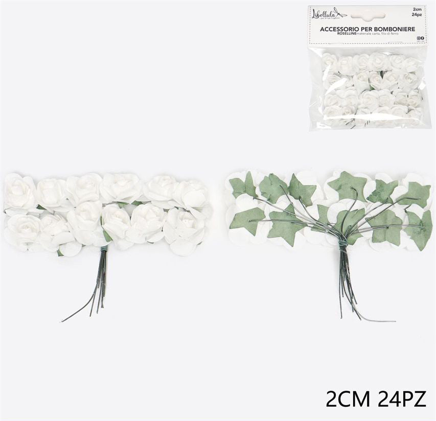 Set da 24 rose finte bianche da 2 cm, ideali per decorazioni eleganti e bomboniere raffinate che durano nel tempo senza perdere bellezza.