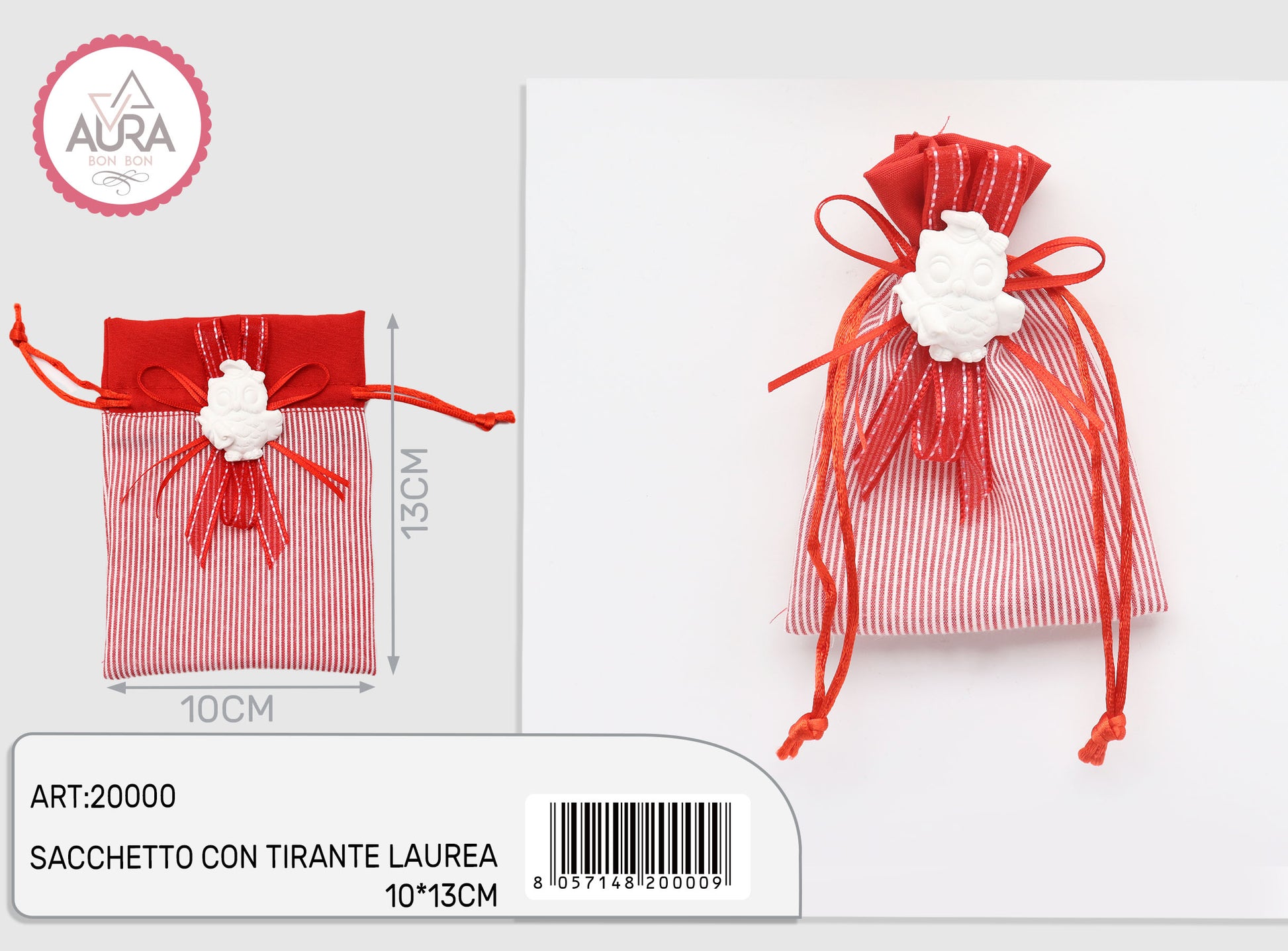 Sacchetto in tessuto bianco e rosso a strisce verticali, con tiranti per la chiusura. Decorato con un tag bianco raffigurante un gufo, simbolo di saggezza. Un dettaglio elegante e simbolico che lo rende ideale per celebrare una laurea, perfetto per contenere confetti o piccoli doni.