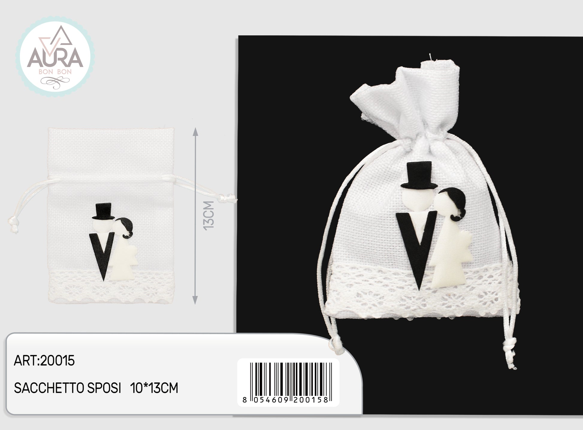 Raffinato sacchetto in tessuto bianco con delicato pizzo sul bordo inferiore, perfetto per celebrare il giorno del matrimonio con uno stile classico e sofisticato. Impreziosito da un elegante applicativo a forma di coppia di sposi stilizzati, questo sacchetto è ideale per contenere confetti o piccoli omaggi, aggiungendo un tocco di romanticismo alla cerimonia.