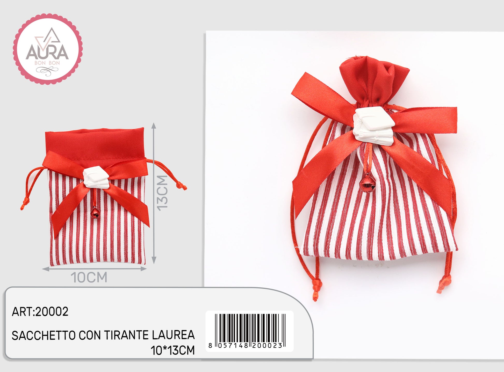 Sacchetto elegante in tessuto bianco e rosso a strisce verticali, con pratici tiranti per la chiusura. Decorato con un campanellino rosso e un tag bianco che presenta un libro, un tocco da laurea e una pergamena, simboli classici di questa importante celebrazione. Perfetto per contenere confetti o piccoli omaggi, aggiungendo un tocco di raffinatezza al momento della laurea.