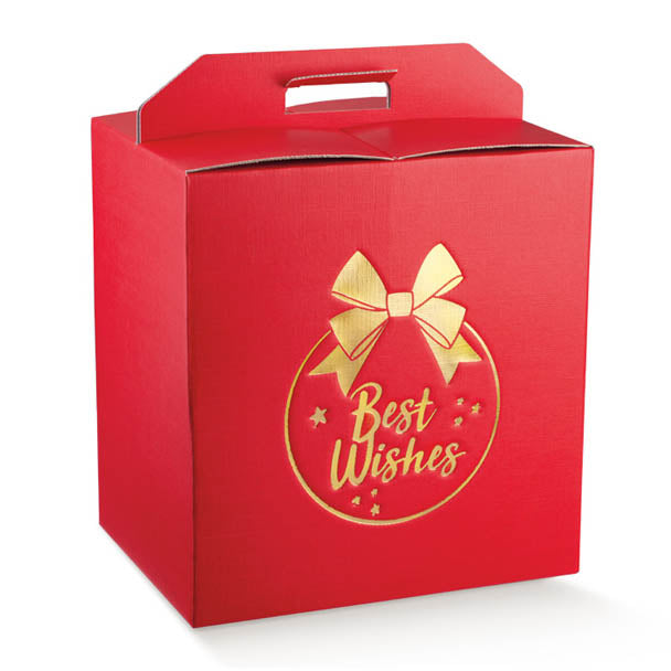 Scatola rosso e oro 280x200x350mm per panettone e bottiglie, perfetta per regali raffinati. Dona eleganza e un messaggio di auguri speciale!