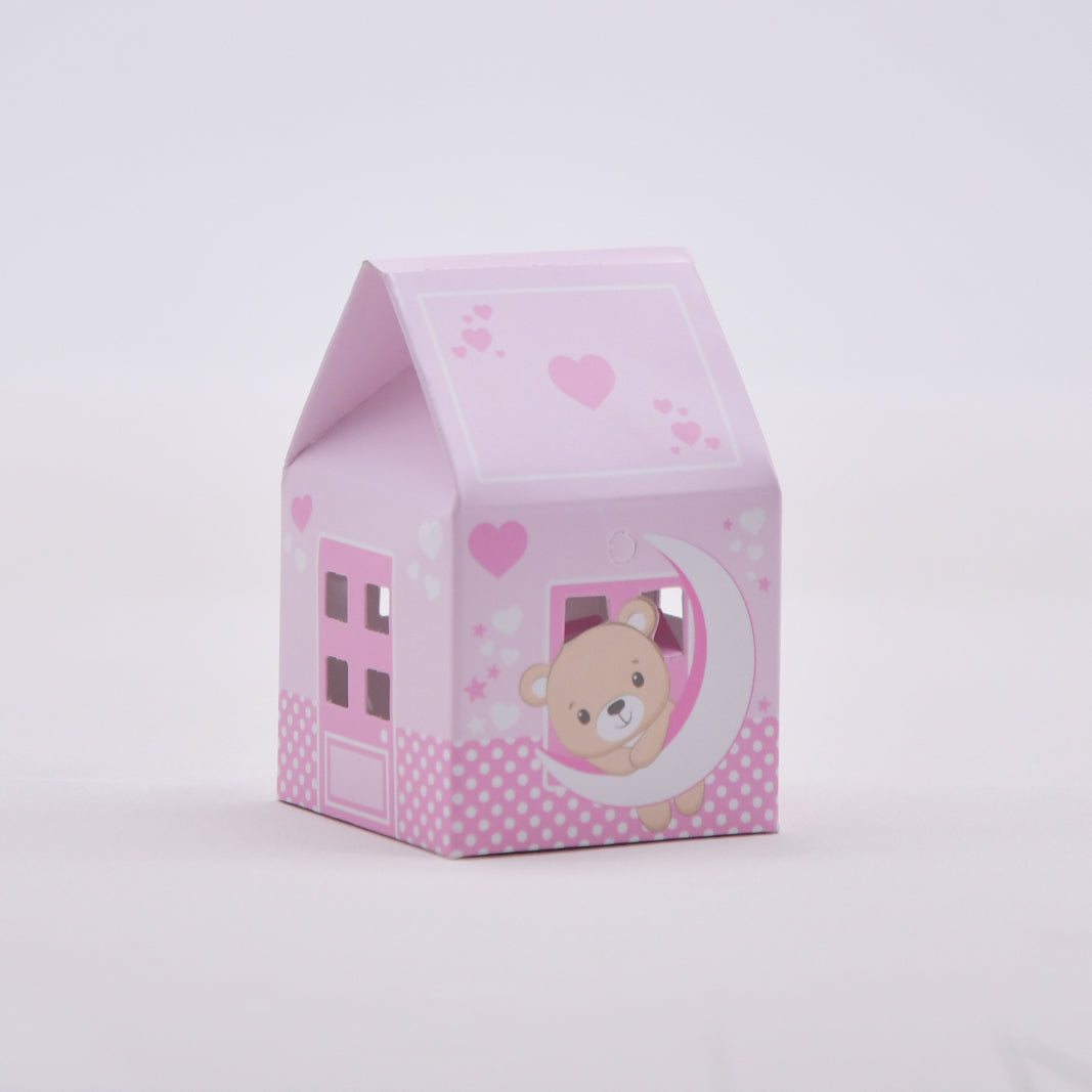 Scatolina casetta con orsetto rosa, ideale per confetti: un tocco dolce e raffinato per festeggiare con dolcezza una nascita o un primo compleanno.