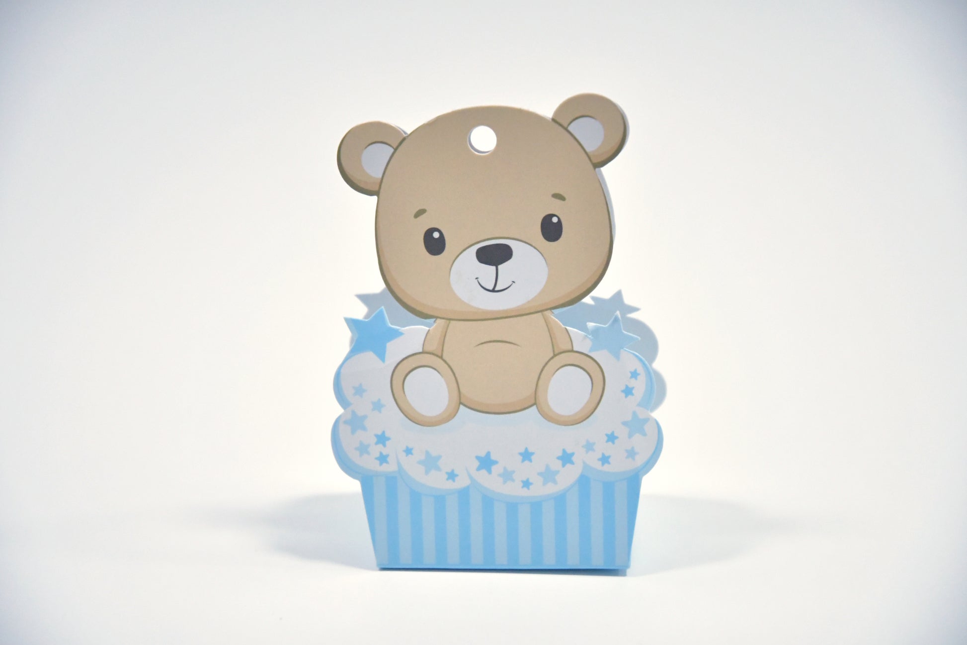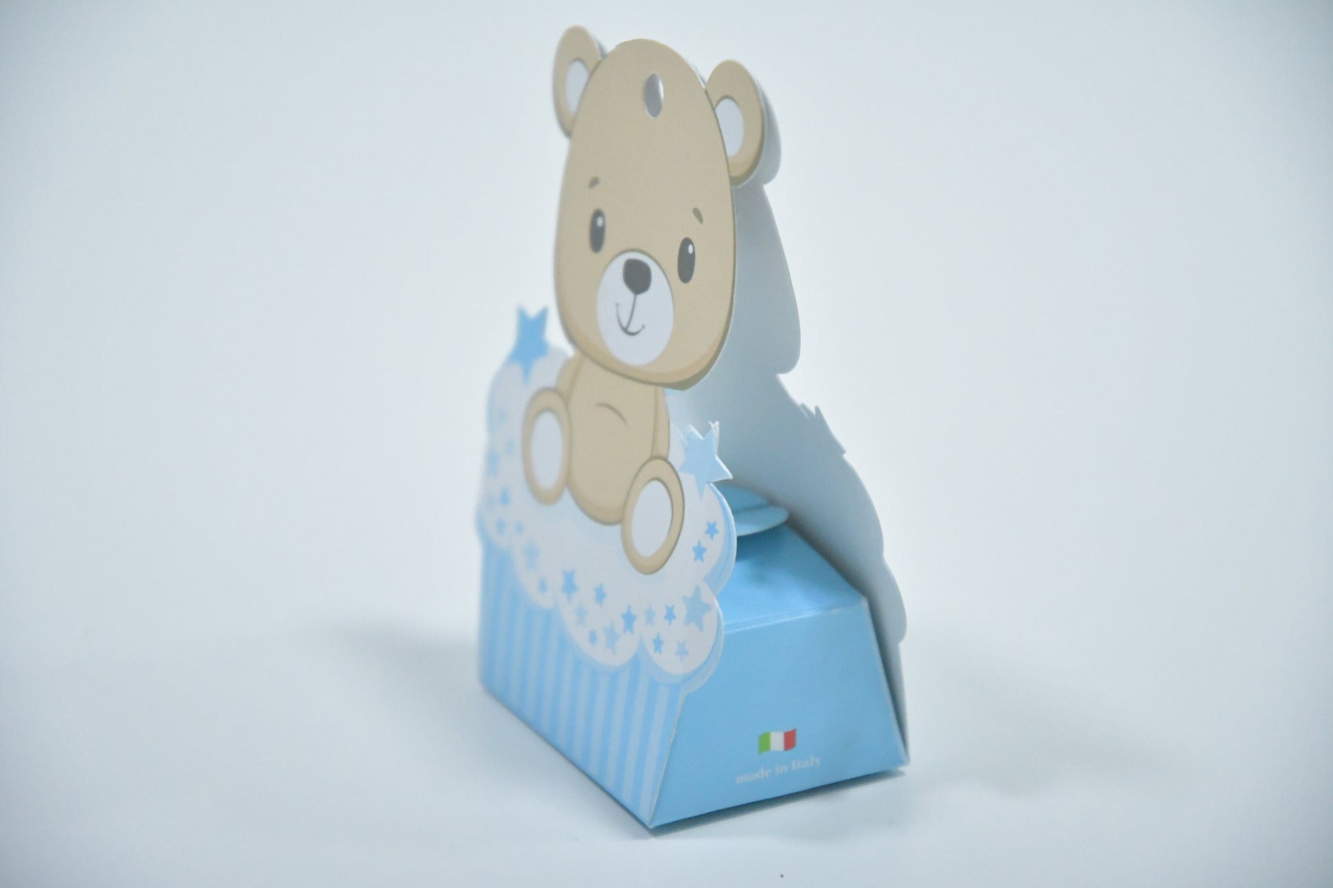 Deliziosa scatolina portaconfetti a tema orsetto, perfetta per nascite, battesimi e baby shower. Con un tenero orsetto su soffici nuvole azzurre e dettagli stellati, aggiunge un tocco dolce e raffinato alla tua festa. Realizzata in cartoncino di alta qualità, è ideale per contenere confetti o piccoli dolci. Made in Italy.