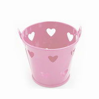 Elegante secchiello portaconfetti rosa in latta con cuori intagliati, misura 5,5x5,3 cm. Perfetto per un tocco romantico e raffinato alle tue ricorrenze.