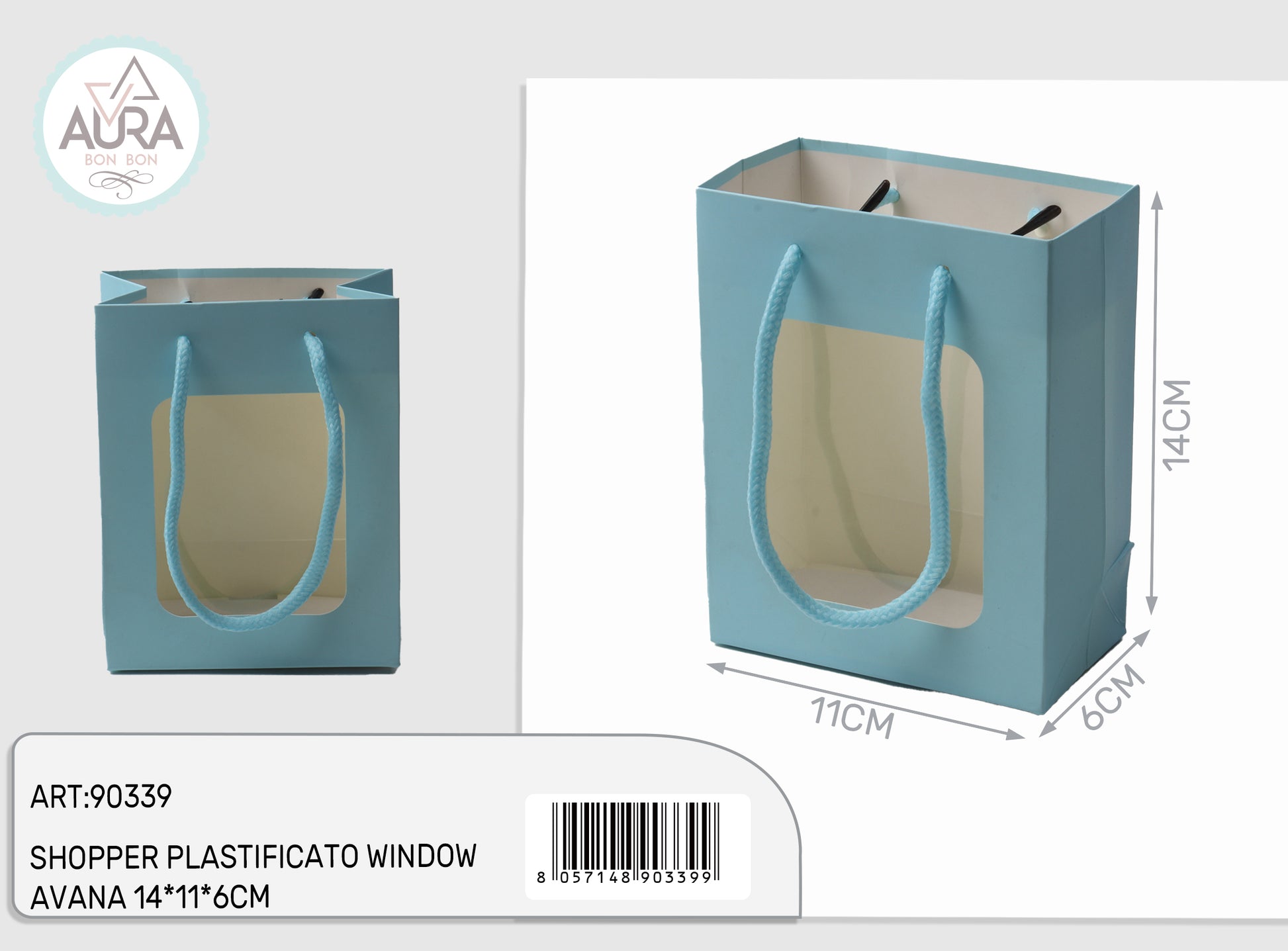 Shopper plastificata con finestra, colore celeste, 11x6x14cm, ideale per confezionare piccoli regali, bomboniere e oggetti speciali. Perfetta per compleanni, nascite e altre occasioni. La finestra trasparente esalta il contenuto, mentre la plastificazione assicura resistenza e un aspetto elegante. Personalizzabile con nastri e decorazioni per un tocco unico.