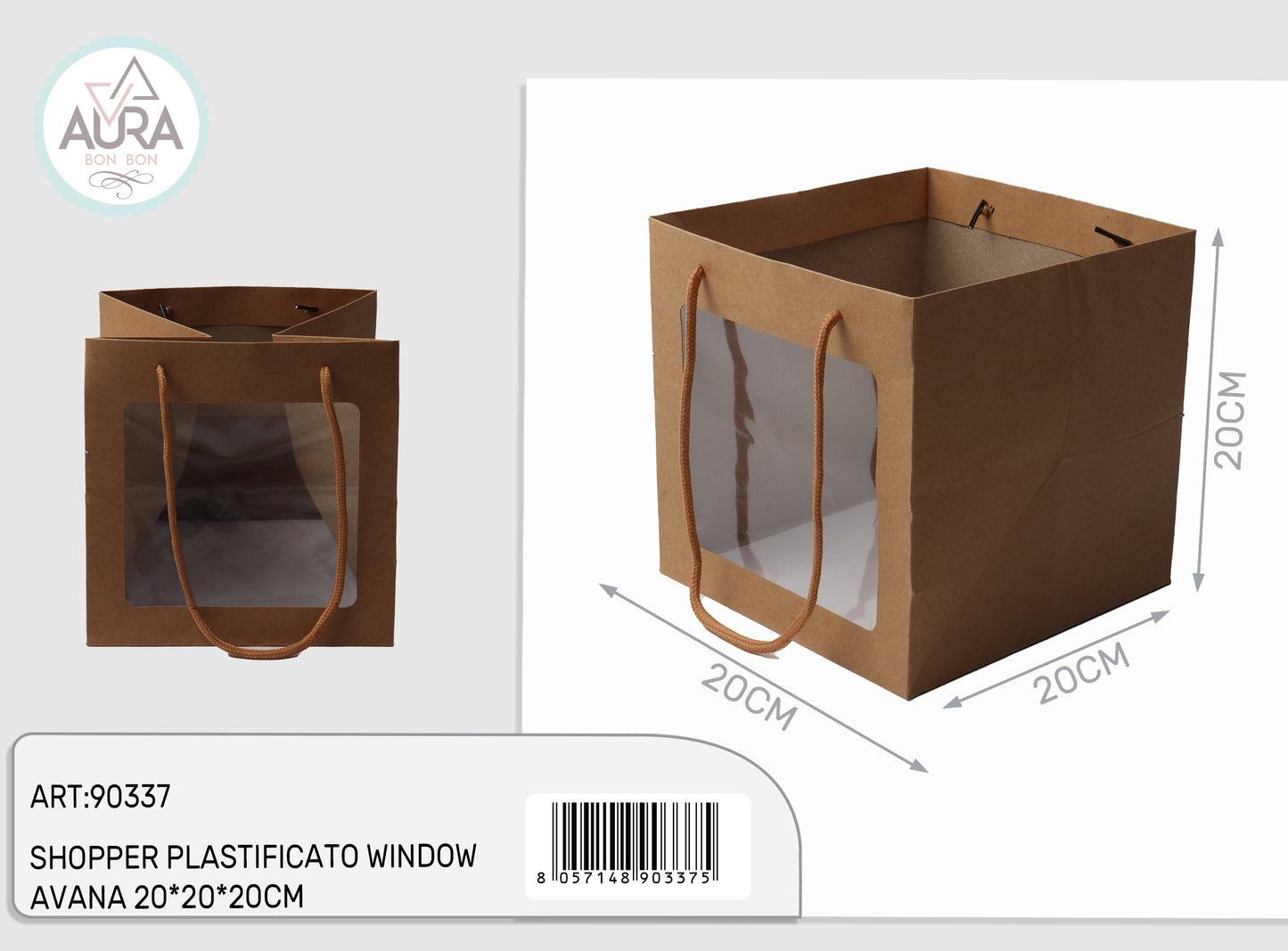Shopper con finestra, colore avana, 20x20x20cm, ideale per confezionare regali, bomboniere e piccoli oggetti. Perfetta per compleanni, matrimoni e eventi con uno stile rustico e naturale. La finestra trasparente valorizza il contenuto, mentre il materiale resistente e il colore avana conferiscono un aspetto caldo e accogliente. Personalizzabile con nastri, fiori secchi o applicazioni per un tocco unico e creativo.
