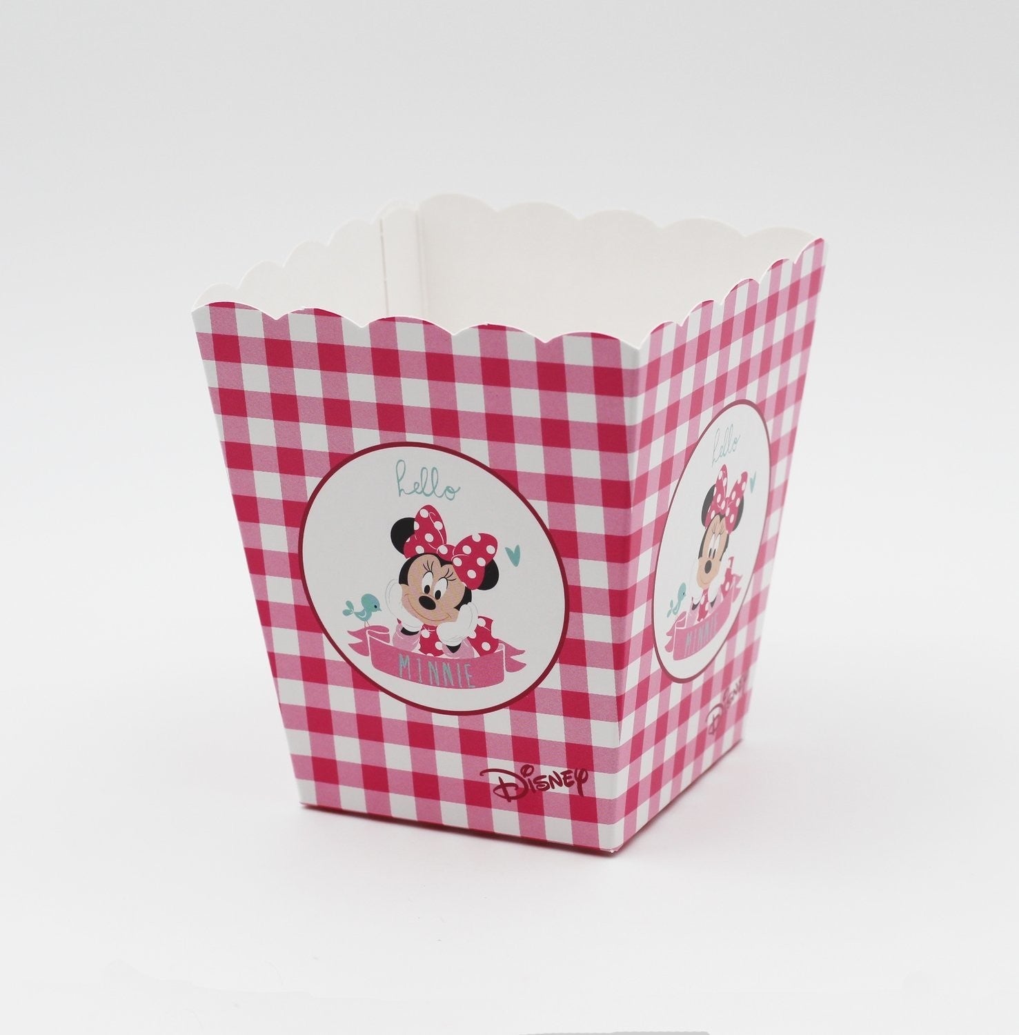 Box popcorn 15x15x18 cm con decorazione Minnie, perfetto per rendere ogni festa più divertente e gustosa con stile unico e colorato.